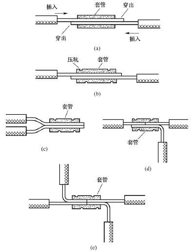 橢圓截面套管使用時,將需要連接的兩根導(dǎo)線的芯線分別從左右兩端相對插入并穿出套管少許,如圖14(a)所示,然后壓緊套管即可,如圖14(b)所示。橢圓截面套管不僅可用于導(dǎo)線的直線壓接,而且可用于同一方向?qū)Ь€的壓接,如圖14(c)所示;還可用于導(dǎo)線的T字分支壓接或十字分支壓接,如圖14(d)和圖14(e)所示。