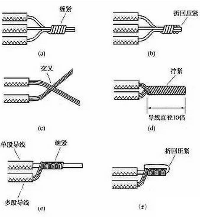 (6)同一方向的導(dǎo)線的連接。當(dāng)需要連接的導(dǎo)線來自同一方向時,可以采用圖10所示的方法。對于單股導(dǎo)線,可將一根導(dǎo)線的芯線緊密纏繞在其他導(dǎo)線的芯線上,再將其他芯線的線頭折回壓緊即可。對于多股導(dǎo)線,可將兩根導(dǎo)線的芯線互相交叉,然后絞合擰緊即可。對于單股導(dǎo)線與多股導(dǎo)線的連接,可將多股導(dǎo)線的芯線緊密纏繞在單股導(dǎo)線的芯線上,再將單股芯線的線頭折回壓緊即可。