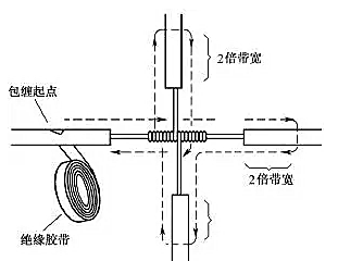對導(dǎo)線的十字分支接頭進(jìn)行絕緣處理時,包纏方向如圖22所示,走一個十字形的來回,使每根導(dǎo)線上都包纏兩層絕緣膠帶,每根導(dǎo)線也都應(yīng)包纏到完好絕緣層的兩倍膠帶寬度處。